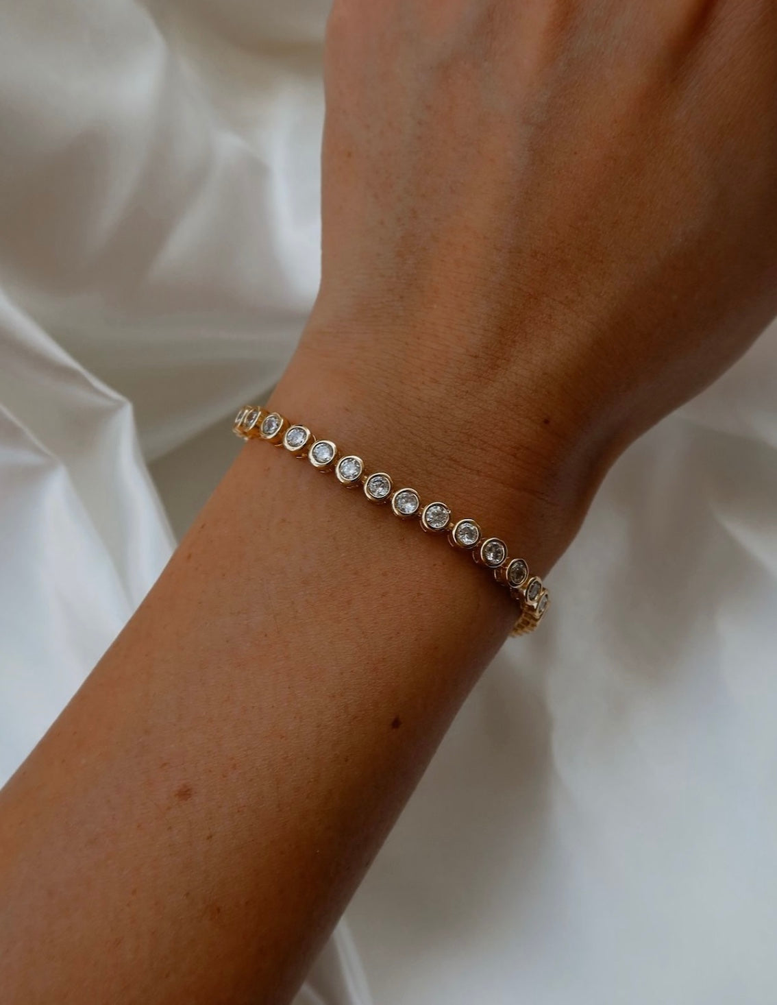 The bezel-set tennis bracelet offers a timeless look that never goes out of style. Designed to reflect light beautifully, it’s a standout piece for yourself or given as a thoughtful gift.