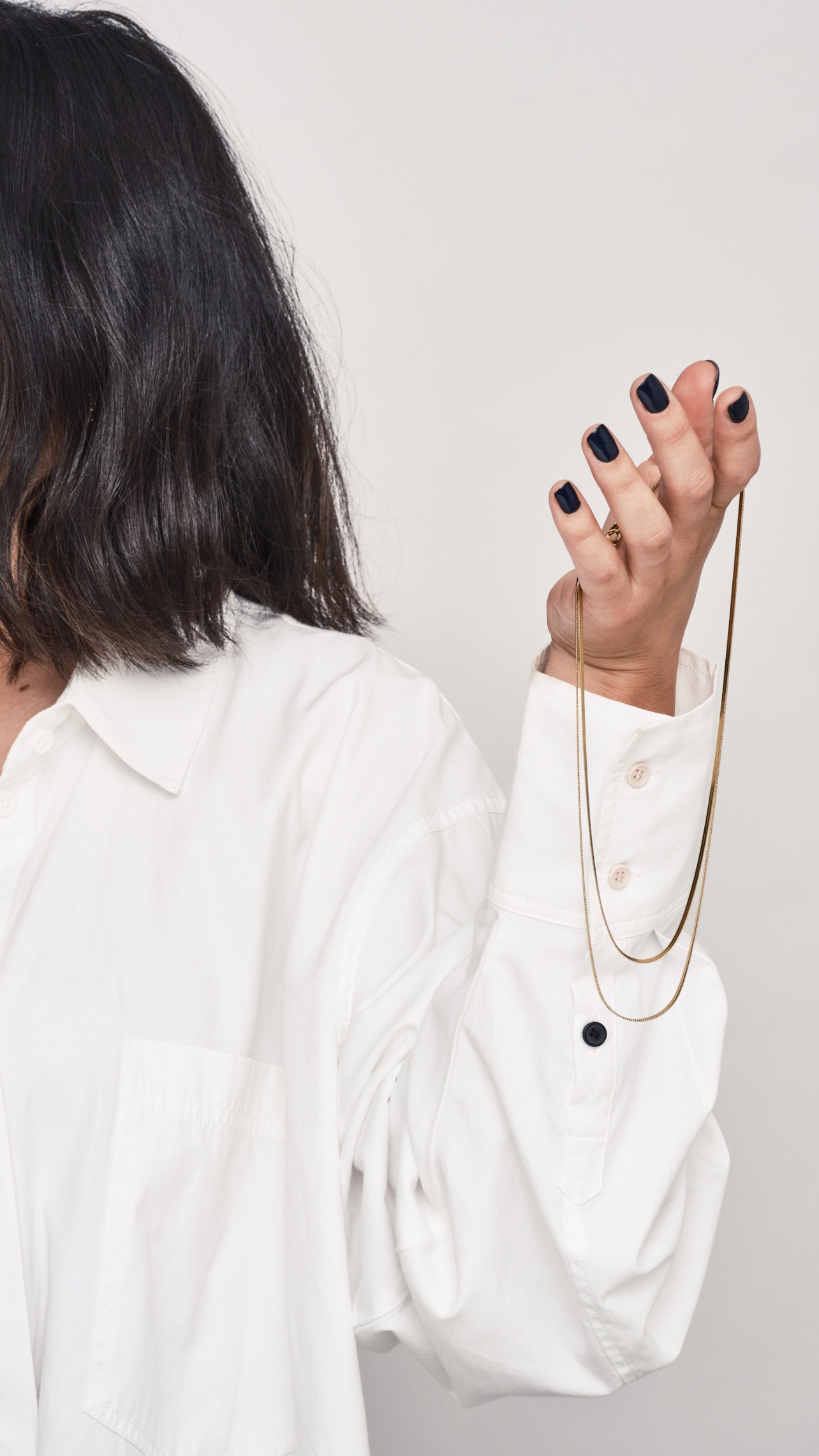 A fine herringbone chain crafted in 14k gold-plated brass. The Fine Chain Necklace includes a rectangular lobster clasp closure for a sleek simple closure.