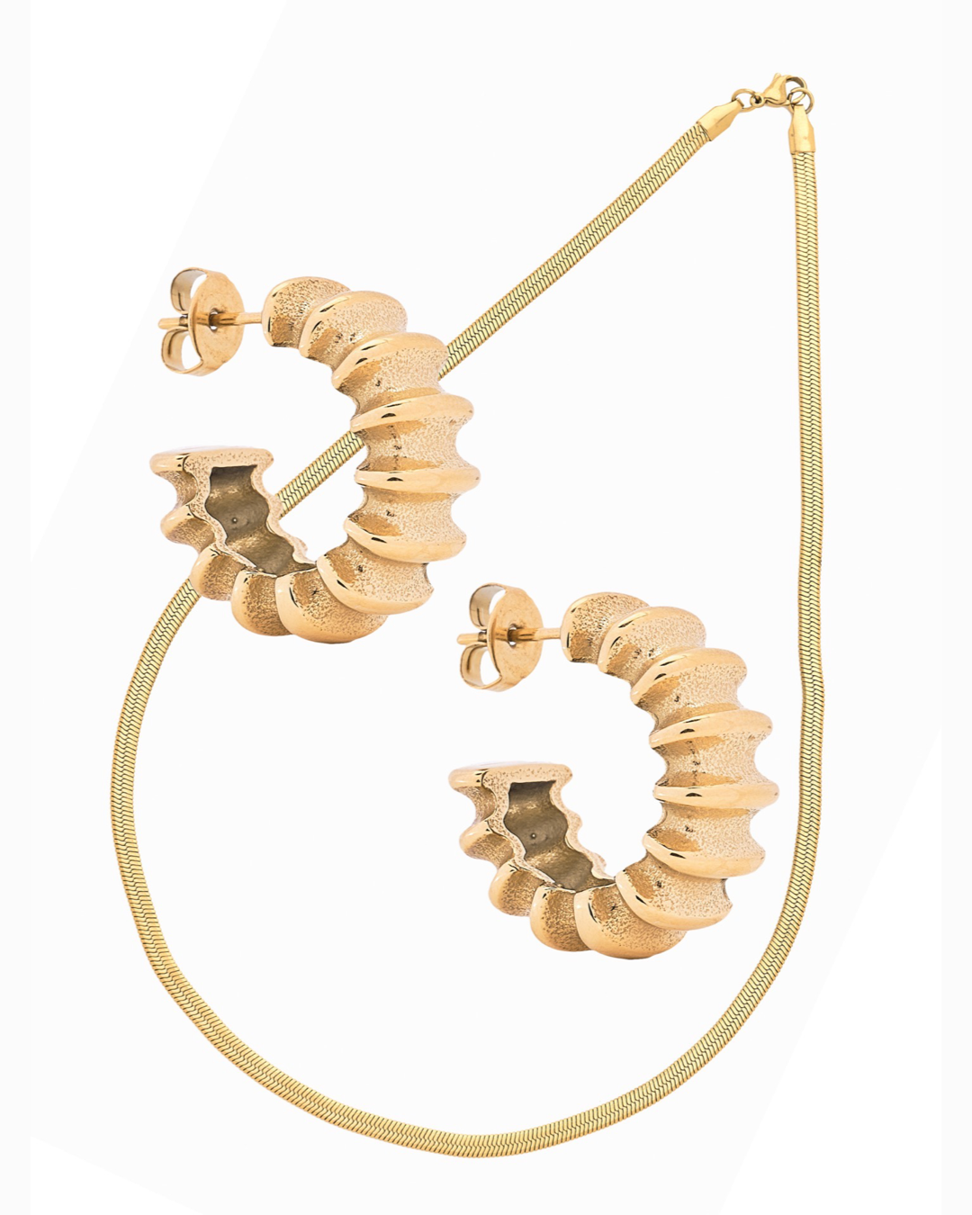 The ones you can't go without. The rib hoops are a mid-size showstopper that you will reach for time and time again. Crafted from 18k gold plating. Finished with classic butterfly backs.