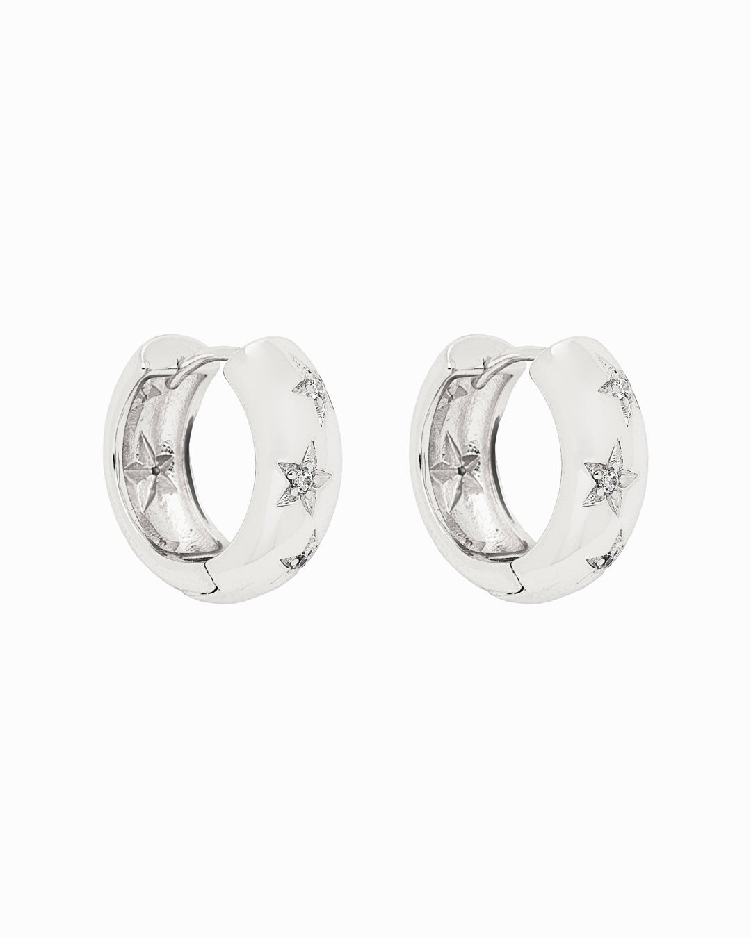 The luminous star studded hoop earrings add a little luxe to any look. Designed to look and feel like 'demi-fine' jewelry, this earring set can be enjoyed season after season.Crafted from silver-plated brass and studded with sparkling cubic zirconia stars. Finished with classic butterfly backs.