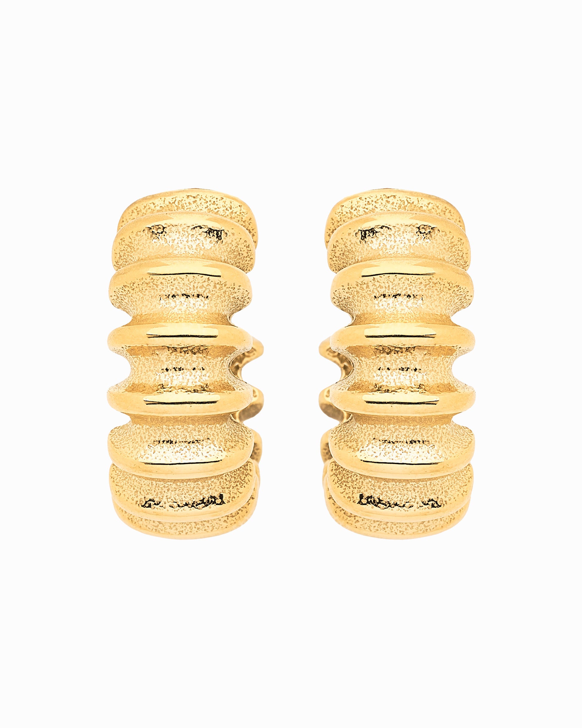 The ones you can't go without. The rib hoops are a mid-size showstopper that you will reach for time and time again. Crafted from 18k gold plating. Finished with classic butterfly backs.